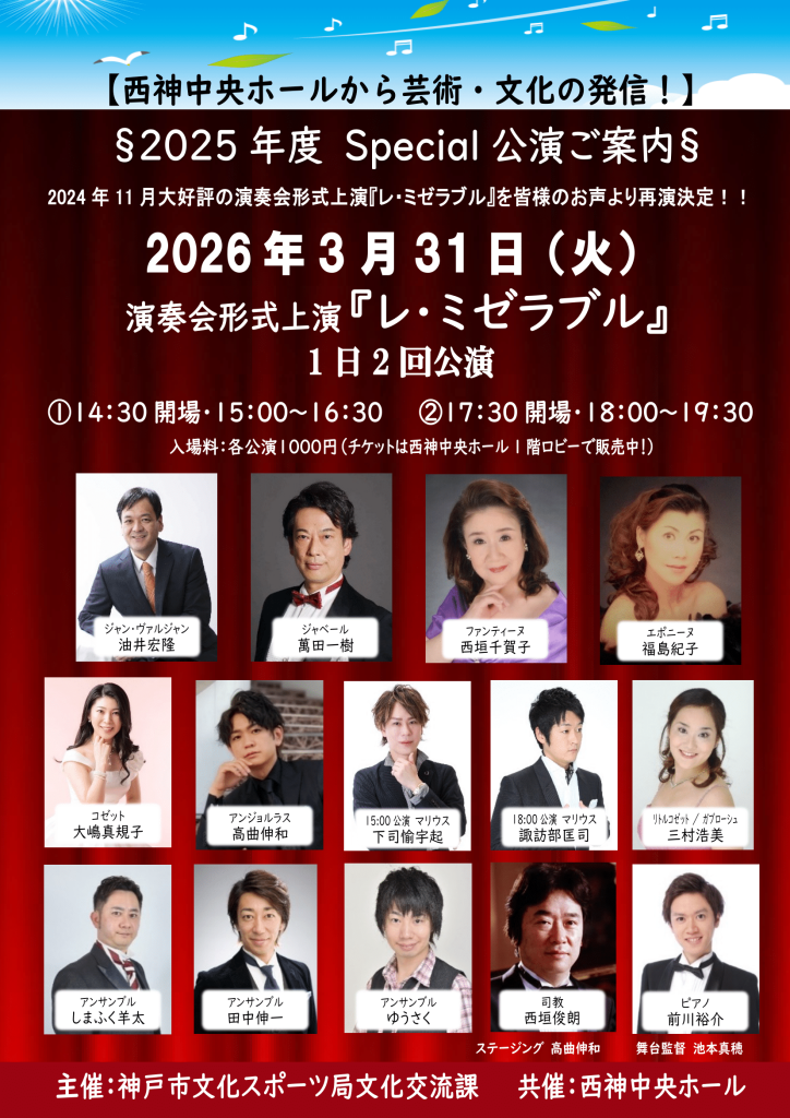 入場料:各公演1000円(チケットは西神中央ホール1階 ホール窓口で販売中!)