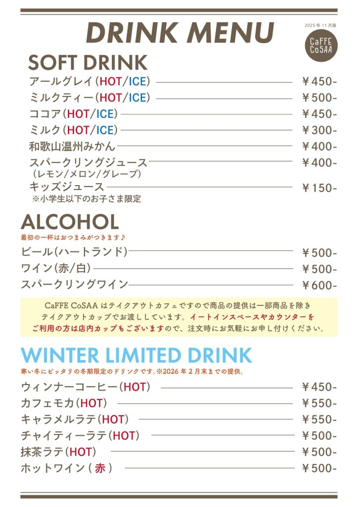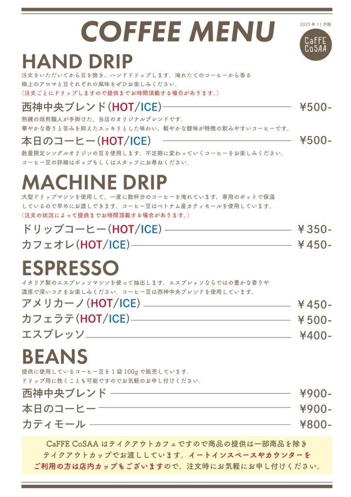 ■ MENU ■ 2025年11月より、コーヒーメニューがさらに充実しました☕豆の販売もおこなっています。 冬の期間限定メニューも要チェック✍✅ コーヒーメニュー(2025年11月版) ドリンクメニュー(2025年11月版) フードメニュー(2025年6月版)