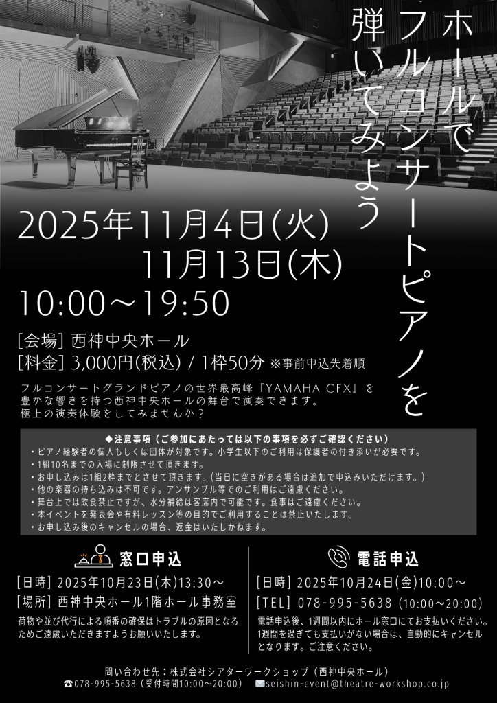 ・ピアノを利用しない場合でも舞台上の隅にピアノを置かせていただきます。ご了承ください。