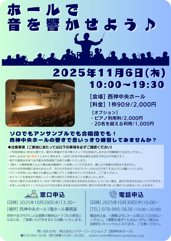 西神中央ホールの響きで思いっきり練習してみませんか?