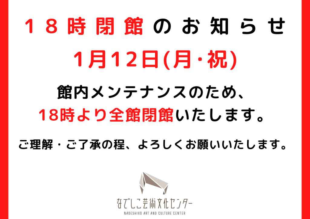 また9/28(日)は、館内メンテナンスのため、なでしこ芸術文化センター・西神中央ホールは18時で営業を終了します。