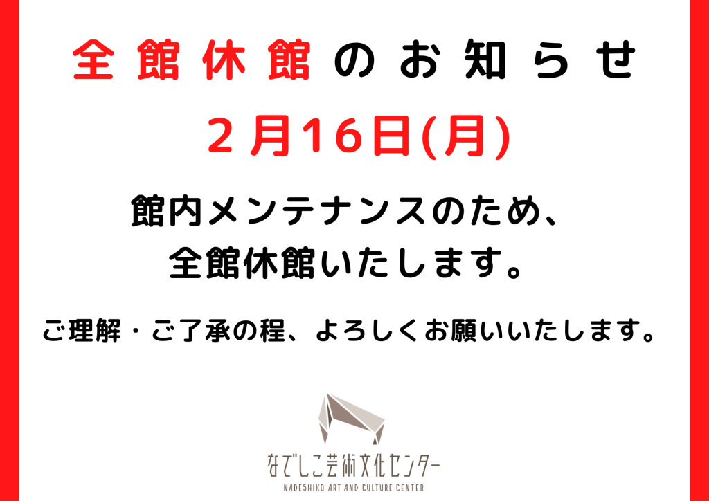 2/16(月)は、館内メンテナンスのため、なでしこ芸術文化センター・西神中央ホールは休館日となります。