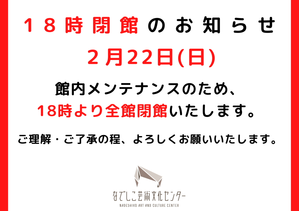 また2/22(日)は、館内メンテナンスのため、なでしこ芸術文化センター・西神中央ホールは18時で営業を終了します。